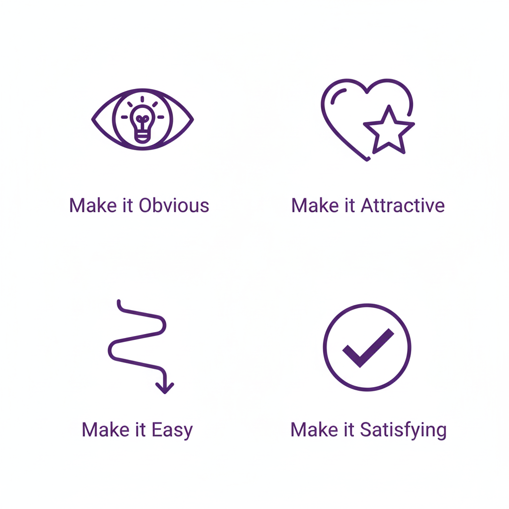 James Clear's Atomic Habits breaks down habit formation into four laws: make it obvious, make it attractive, make it easy, and make it satisfying. Let's adapt each one specifically for chronic pain management.