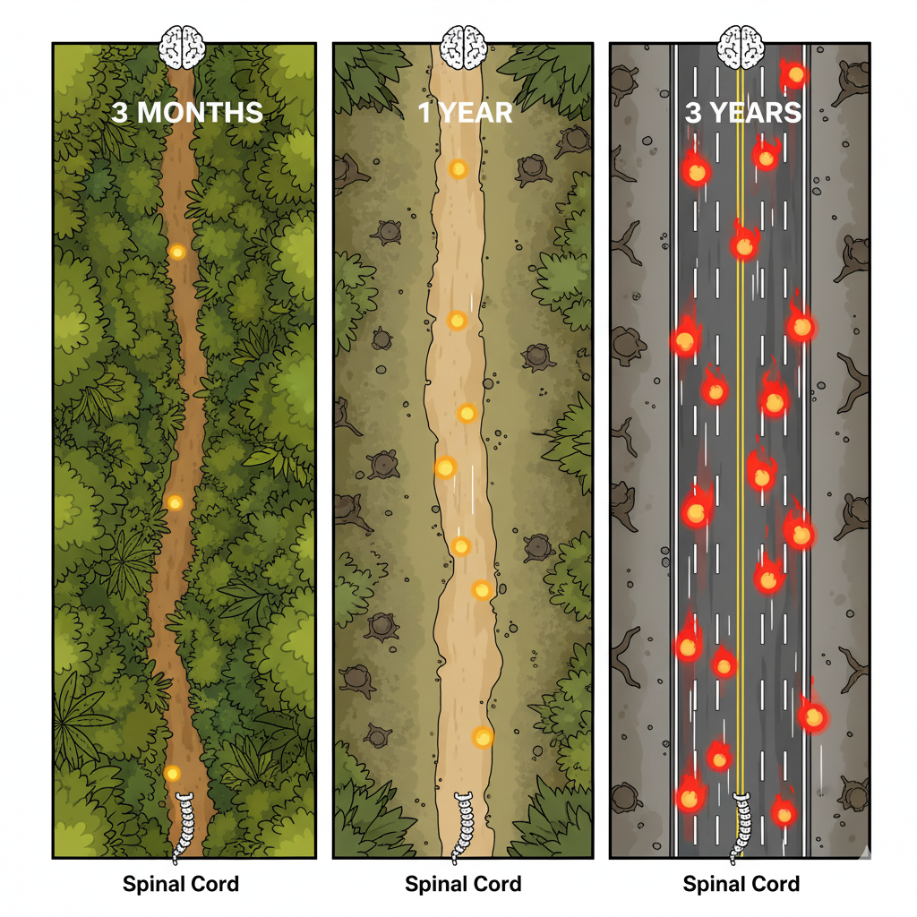 Now imagine the pain signal walks that path every day, many times a day.